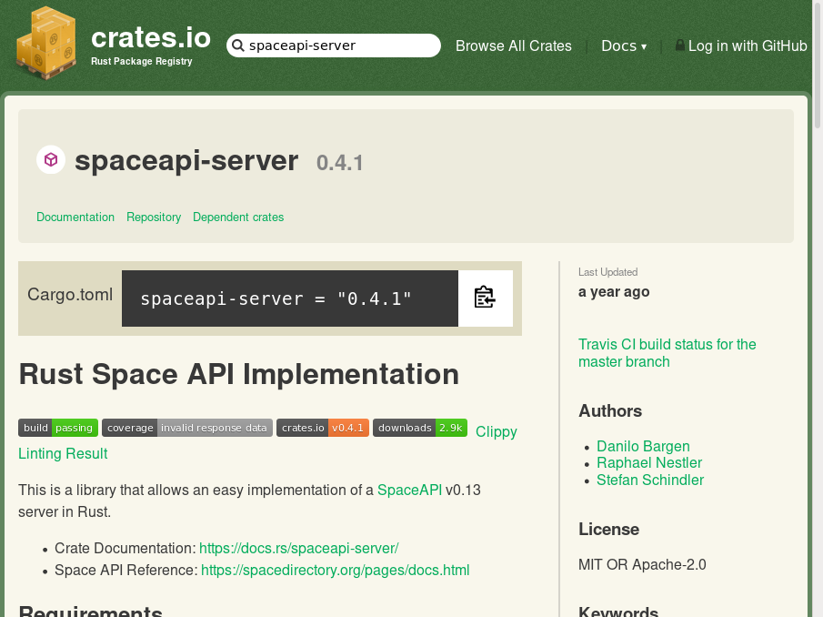 A Rust crate that enables you to run your own SpaceAPI server with support for dynamic sensor data.